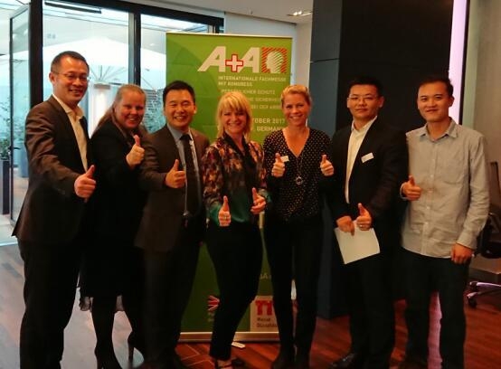 (左三为新天会展的总经理郭峰先生 、左一为新天维瑞德(上海)会展有限公司的总经理张纪峰先生、右一为新天会展的劳保项目负责人蔡资燕先生,右二为杜塞尔多夫展览(中国)公司的项目经理,其它为德国A+A劳保展的负责人或高级经理)